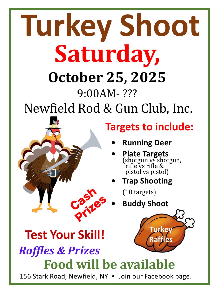Club shooting range is located on Johnson Road in Freeville, NY and has two lighted trap fields (one handicap to 27 yards) as well as 200 yards long rifle and pistol range. The range rules are posted online as well as on the range and must be followed at all times. The rifle range is closed during trap shooting and club events, please check events page before going to the rifle range. Rifle range can be used Monday-Saturday 8am-dusk, Sunday 10am-dusk, rifle range is closed Tuesday 9am-2pm, Thursday 2pm-6pm and Sunday 10am-1pm. Trap fields are open until 9pm (lights must be on when dark), during Club events trap fields may be opened at 8am on Sundays. To apply for membership (or to renew one): stop by the club on Tuesday between 9am-11am or on Thursday, between 4:00pm - 6:00pm. The end time is subject to change based on time of year and current events, leagues, etc. Our Membership year runs October 1 to September 30. Annual Membership costs are $30 per Adult (18 years & older) and $5 per Junior member (ages 12-17). Annual dues are not pro-rated at any time. Members are asked to be able to show a current membership card when using the Rifle Range. The Club is open each Thursday between 4:00pm and 7:00pm and each Tuesday between 9am ans 11am for trap shooting and this is the best time to apply for membership and meet Club officers. Information about the Club events and messages are posted on the Club House front doors and on this website. Please sign up for the Club mailing list to receive alerts and information by e-mail, especially if your are a Club member!